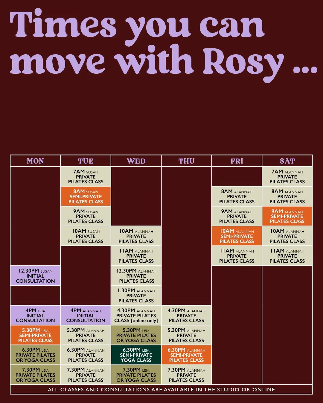 No problem — online sessions are available and a great way to keep your practice going from wherever you are. Email us ahead fo your trip and Rosy Movement will help you plan around your time away.